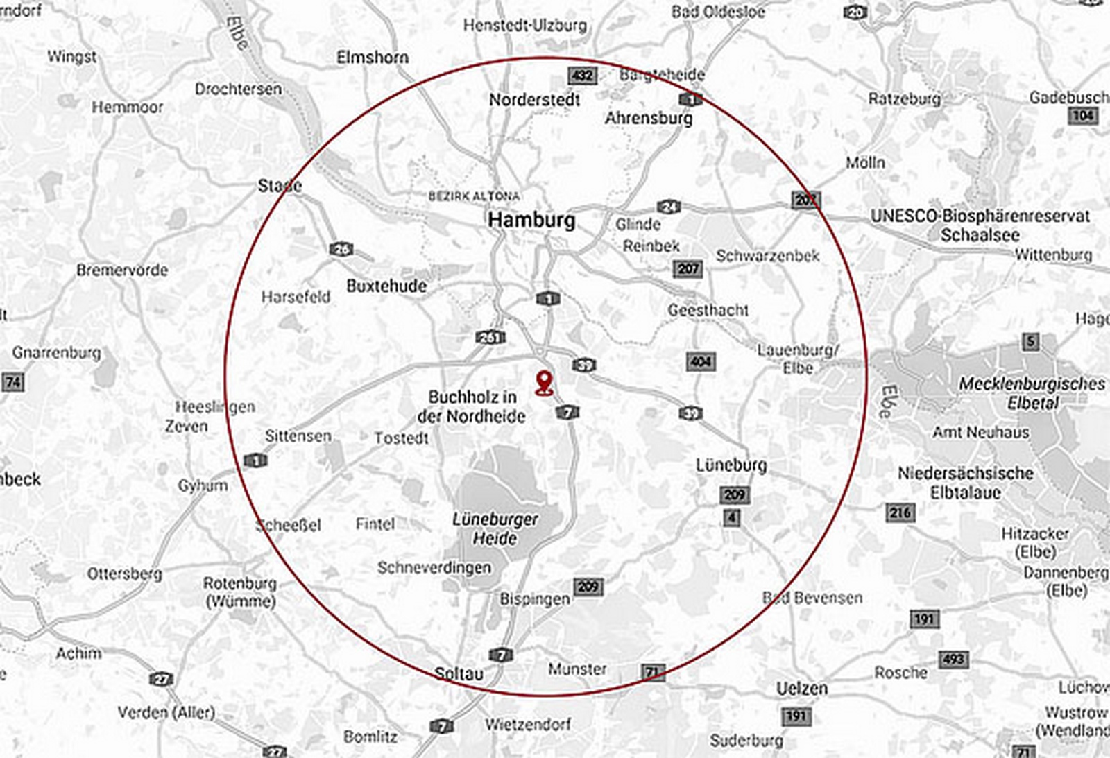Anfahrten innerhalb Hamburgs, im Landkreis Harburg, nach Lüneburg und in Teile der angrenzenden Regionen sind im Preis bereits enthalten. Die Grafik zeigt den ungefähren Umkreis.